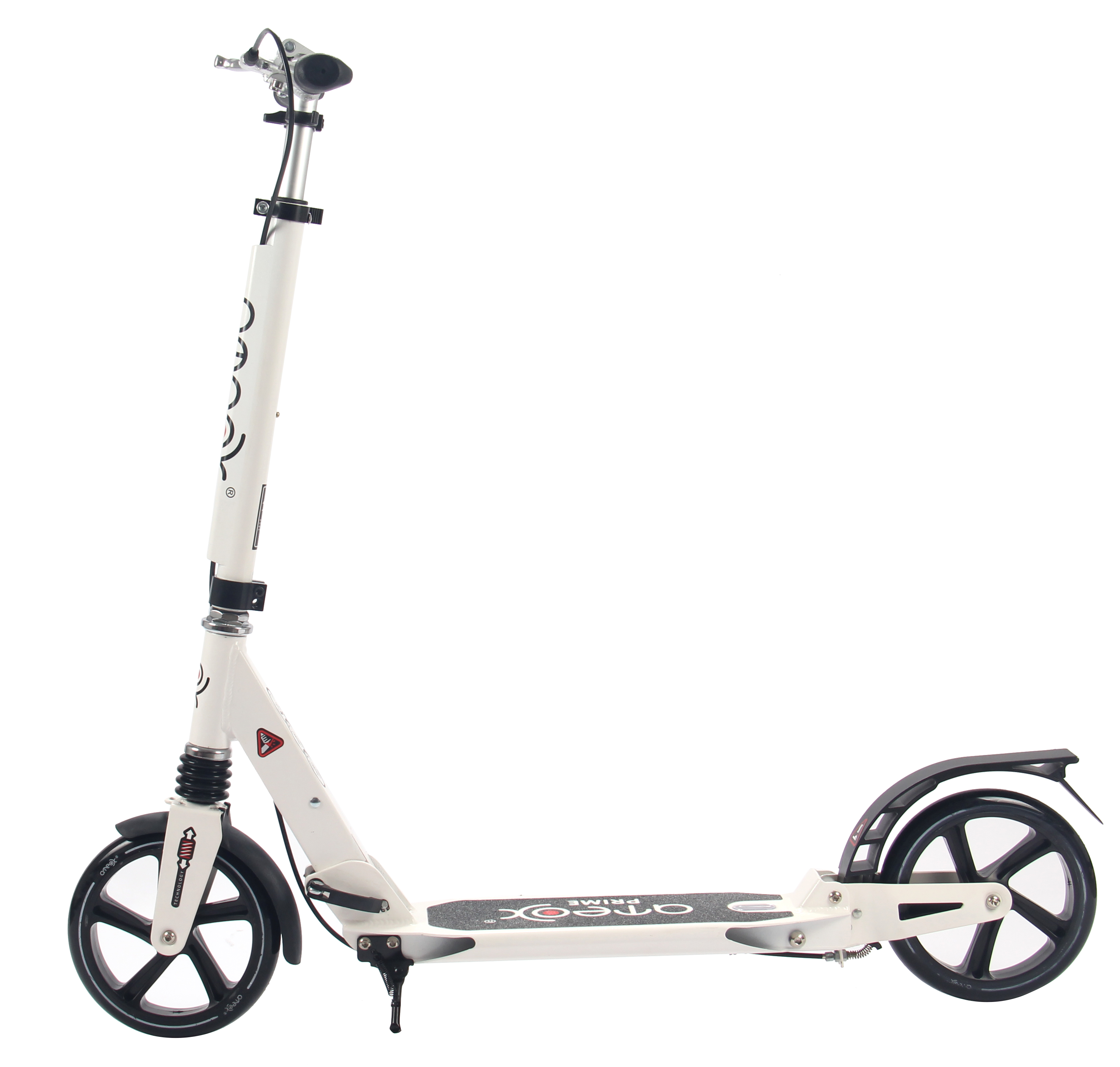 Самокат для взрослых Ateox PRIME с большими колесами и ручным тормозом (Белый) - это обновленная и усовершенствованная версия всем так полюбившегося самоката ATEOX L-200-2S! Он оснащен двумя амортизаторами, причем задний амортизатор регулируемый, что позволит настроить жетскость самоката так, как нужно именно Вам! Большие, 200 миллиметровые полиуретановые колеса с подшипниками ABEC 7 обеспечат отличный накат и скорость практически на любой поверхности дороги, а ручной тормоз придаст уверенности торможению. Анатомические грипсы (ручки) самоката изготовлены из высококачественной резины и не позволят соскользнуть вашим рукам при катании, а антилюфтовая система крепления надежно фикирует рукоятки руля для полного контроля над самокатом. Удобная, легкая и надежная система складывания позволит передвигаться с самокатом по городу без проблем - просто сложите его, наденьте на плечо с помощью ремня-держателя и Вы уже в метро или автобусе - едете туда, где Вам хочется кататься! Осталось только выбрать один из ярких и стильных оттенков и вперед - навстречу приключениям вместе с самокатом PRIME от АТЕОХ!